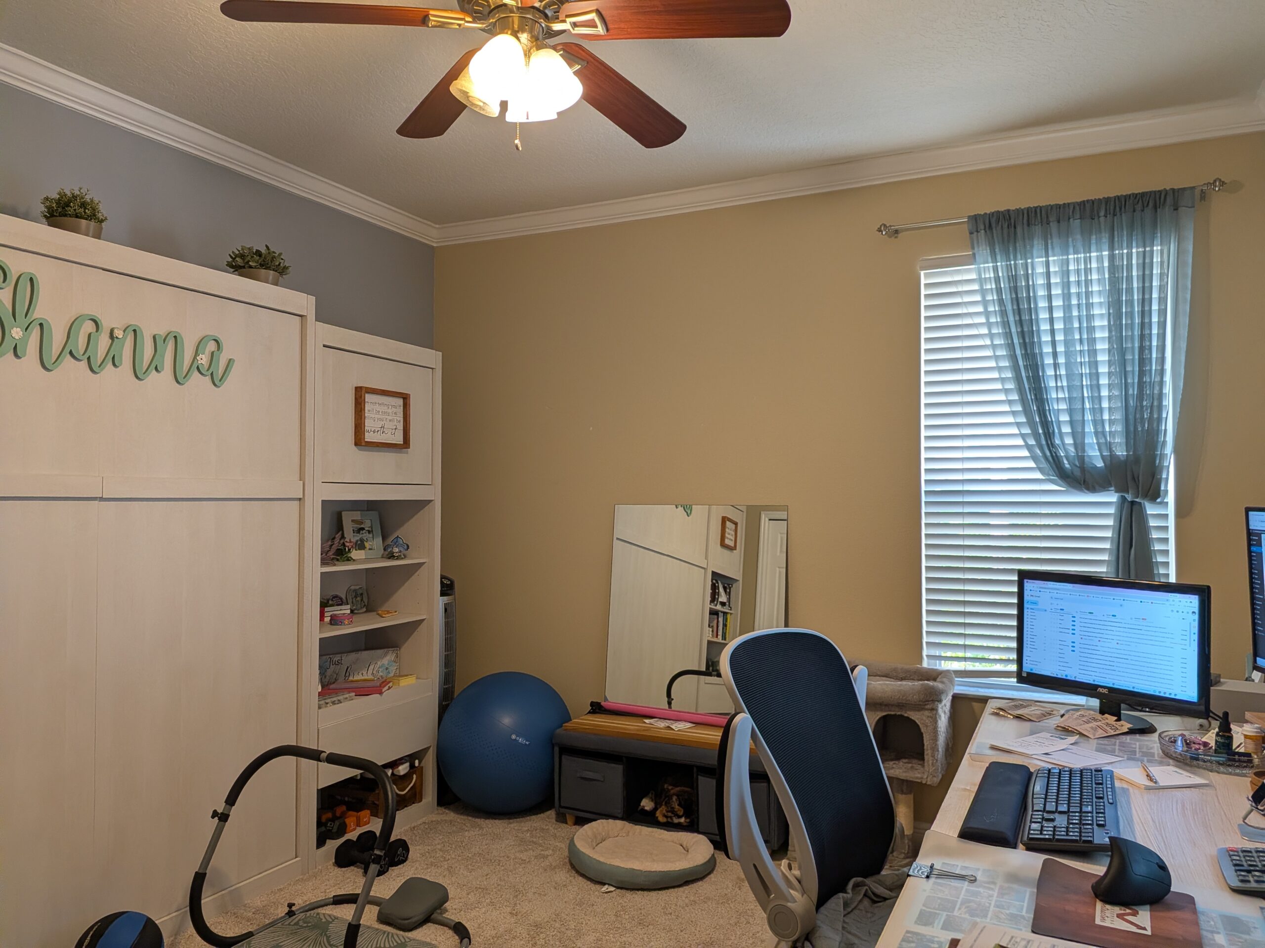 In the distraction corner, though? I allow myself color. A dumbbell or two. A yoga mat. A small bench. A chair for journaling when things get loud upstairs. It’s my clarity corner, and I use it daily — sometimes for sanity, sometimes for strategy.